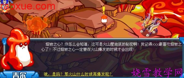 来到火山山洞,吉尔说熔岩之心是火山星地底的秘密,某人最喜欢熔岩之心了,不过熔岩之心只有在火山爆发的时候才会出现。
