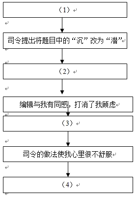 (1)“我”听舰队司令谈看完小说后的想法(司令是“我”小说的第一个读者)[关键词是“司令”或“中将”、“小说”或“稿子”]。(2)“我”反复思考还是觉得“沉”比“潜”好。(3)司令通过出版社的头头,将“沉”改为“潜”。(4)潜艇艇长揭开了“潜”比“沉”好的原因。