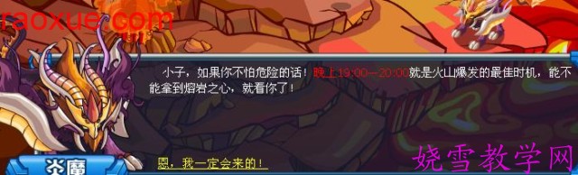 炎魔说晚上七点到八点就是火山爆发的最佳时机,到时候能不能拿到熔岩之心就看你的了。